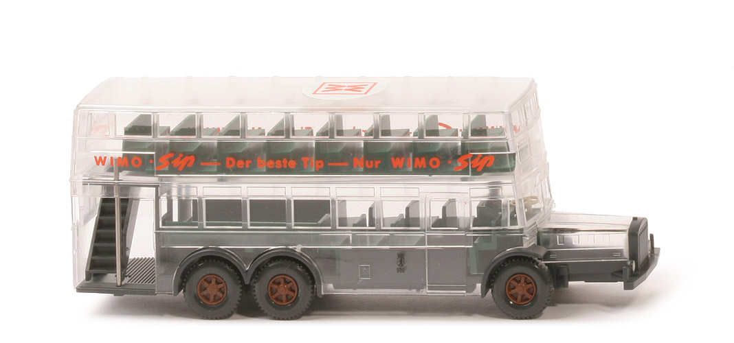 Karosserie Farbe | klar transparent | Einstieg hinten | offen | Verglasung | klar | Fahrer | ca. basaltgrau | Fahrer Bemalung | Gesicht | Lenkrad | ca. cremeweiß | Farbe Sitze | patinagrün | hintere Fahrgastraumbegrenzung | anthrazit | Treppe hinten | anthrazit | Haltestange | Metallachse, vernickelt | Chassis Farbe | anthrazit | Kardanelement Farbe | anthrazit | Bodenprägung | neues WIKING-Logo,Germany | Beschriftung | Wimo-Sip - der beste Tip (... s. Foto) | Beschriftung Art | Druck | Zielbeschriftung vorne | ohne | Stadtwappen/BVG-Emblem | beidseits | sonstige Bedruckung | Scheinwerfer silbern | Räder Typ | 12 mm, Profil grob | Felgen | Trilex, ca. lehmbraun |