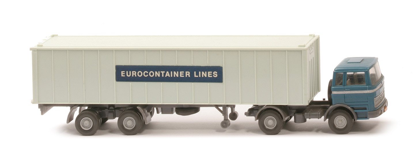 | | Zugmaschine | | Kabine oben | azurblau | | Kabine unten | azurblau | | Streifen | mit | | Verglasung | klar | | Inneneinrichtung | ca. lichtgrau | | Lenkrad | ohne | | Grill | silbern | | Stoßstange, Radlauf vorn | staubgrau | | Chassistyp | neu | | Chassisfarbe | staubgrau | | Radlauf hinten | staubgrau | | Reserverad | hinter Kabine | | Sattelpfanne | neu, für dünnen Bolzen | | Räder | 12mm, Profil fein | | Felgen | silbergrau | | | Container | | Art | 1 x 40 ft gerippt | | Dach | helllichtgrün | | Korpus | helllichtgrün | | Türen | helllichtgrün | | Unterkante | schmal | | Beschriftung | EUROCONTAINER LINES | | Beschriftung Grösse | 7 Felder, Papieraufkleber | | | Auflieger | | Farbe | staubgrau | | Unterfahrschutz | ohne | | Königsbolzen | dünn | | Räder | 12mm, Profil fein | | Felgen | silbergrau |