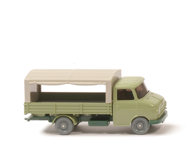Kabine | helles hellmaigrün | Haube | schräg | Dach | mit 4 Längsstegen | Verglasung | stark getönt | Inneneinrichtung | ohne | Bedruckung Scheinwerfer | silber | Bedruckung Grill u. Nr.-Schild | ohne | Chassis Farbe | ca. kieferngrün | Chassis Bodenprägung | neues Wiking-Logo | Bedruckung Rückleuchten | ohne | Pritsche Farbe | helles hellmaigrün | Pritscheneinlage | silbern | Plane | kieselgrau, Seiten offen | Räder | 9 mm, Nabe glatt | Räder Farbe | ca. staubgrau |