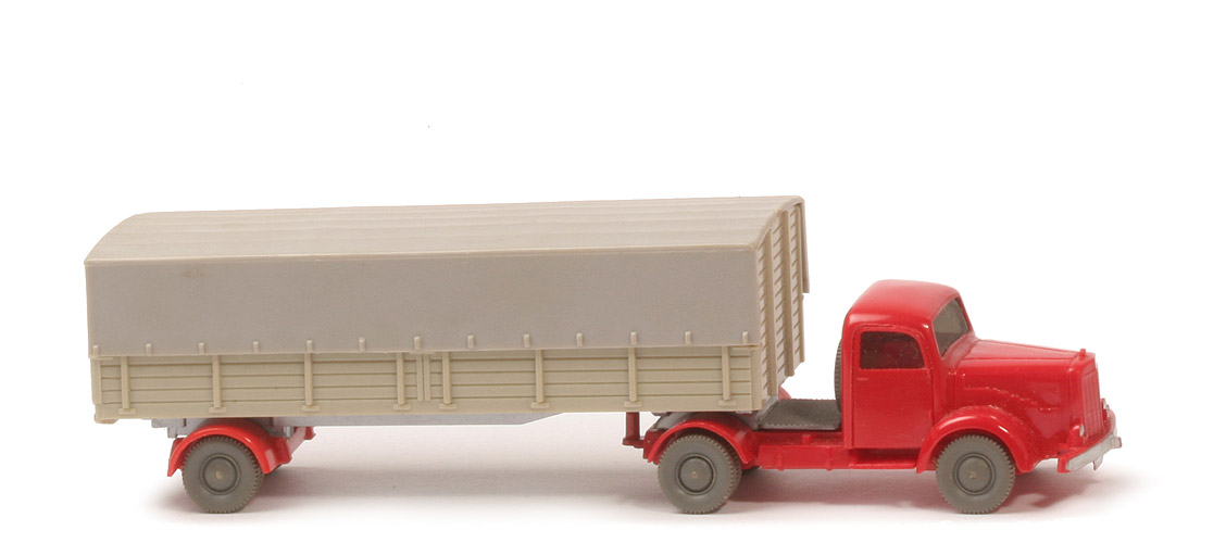 | | Zugmaschine | | Farbe Kabine | rot | | Version Kabine | ohne Schlitz hinter Nrn-Schild | | Farbe Chassis | rot | | Bemalung | Scheinwerfer, Stoßstange | | Sattelpfanne | alt, ohne Steg, für kleinen KöBo | | Chassis | Version 2 | | Achshalterungen | geschlossen | | Bodenprägung | WM ohne Kreis | | Reserverad | hinter Kabine | | Räder | 10mm, neuere Ausführung | | | Auflieger | | Farbe Pritsche | grünbeige | | Farbe Chassis | silber | | Farbe Achseinheit | orangerot | | Bodenprägung Pritsche | WM im Kreis | | Bodenprägung Chassis | WM ohne Kreis hinter Königsbolzen | | Königsbolzen | mittig auf Aufnahmeplatte | | Rückleuchten | ohne | | Nummernschild | gesilbert | | Achshalterung | offen | | Räder | 10mm, neuere Ausführung | | | Plane | | Farbe | ca. platingrau | | hinten | offen | | Innenprägung | ohne |