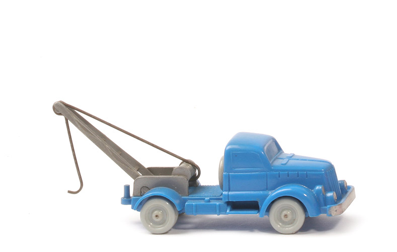 Achsen | Rollachser | Farbe Kabine | himmelblau | Farbe Chassis | himmelblau | Bemalung | Scheinwerfer, Stoßstange | Chassis | Version 1a | Achshalterungen | geschlossen | Bodenprägung | WM (ohne Kreis) | Reserverad | hinter Kabine | Kranaufbau | silbern | Kranausleger | silbern | Haken und Zugseil | einteilig Draht | Räder | sog. Porzellanräder |
