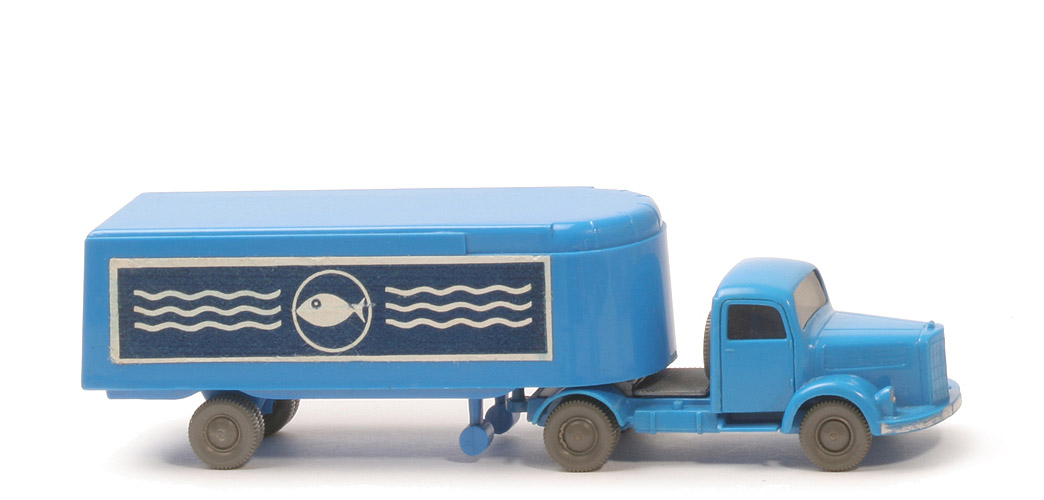 | Zugmaschine | Farbe Kabine | himmelblau | Farbe Chassis | himmelblau | Bemalung | Scheinwerfer, Stoßstange | Sattelpfanne | alt, ohne Steg, für kleinen KöBo | Achshalterungen | geschlossen | Bodenprägung | WM (ohne Kreis) | Reserverad | hinter Kabine | Räder | neuere Ausführung | | Auflieger | Farbe Oberteil | himmelblau | Farbe Unterteil | himmelblau | Radlauf | ohne Kotflügel | Bodenprägung | WM im Kreis | Rückleuchten | ohne | Dach | glänzend | Aufkleberart | Papier, matt | Beschriftung | Fisch mit Wellen (s. Foto) | Räder | neuere Ausführung |