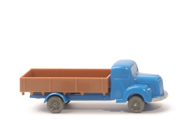 Achsen | Rollachser | Farbe Kabine u. Chassis | himmelblau | Kabinenboden | offen, hier Prägung M | Innenprägung | M | Grill | glatt | Bemalung Kabine | Scheinwerfer, Stoßstange | Pritsche | Seiten glatt, keine Kante oben | Farbe Pritsche | ockerbraun | Zughaken | nach unten | Zapfen | Rundzapfen | Befestigung Pritsche | gesteckt | Räder | 10mm, ohne Profil |