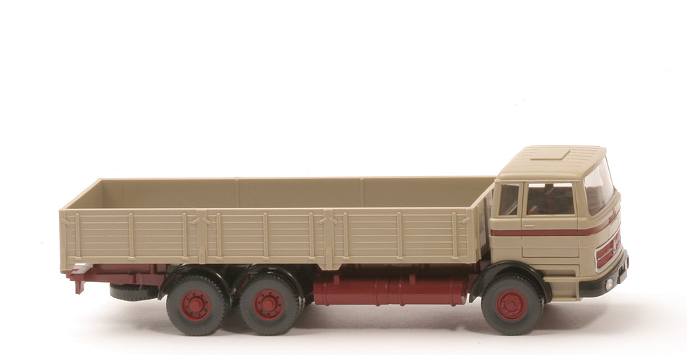 | Fahrzeug | Kabine oben | gelbgrau | Kabine unten | gelbgrau | Streifen | ca. braunrot | Verglasung | klar | Inneneinrichtung | ca. lehmbraun | Lenkrad | integriert | Stoßstange, Radlauf vorn | schwarz | Chassisfarbe | braunrot | Radlauf hinten | 2-teilig, schwarz | Reserverad | unter Chassis gesteckt | Pritsche | gelbgrau | Pritscheneinlage | silbern | Räder | 12mm, Profil grob | Felgen | braunrot, 10-Loch |
