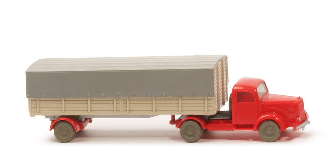 | Zugmaschine | Farbe Kabine | orangerot | Version Kabine | ohne Schlitz hinter Nrn-Schild | Farbe Chassis | orangerot | Bemalung | Scheinwerfer, Stoßstange | Sattelpfanne | alt, ohne Steg, für kleinen KöBo | Chassis | Version 2 | Achshalterungen | geschlossen | Bodenprägung | WM (ohne Kreis) | Reserverad | hinter Kabine | Räder | 10mm, ältere Ausführung | | Auflieger | Farbe Pritsche | hellgelbgrau | Farbe Chassis | silber | Farbe Achseinheit | orangerot | Bodenprägung Pritsche | WM im Kreis | Bodenprägung Chassis | WM vor Königsbolzen | Königsbolzen | nach hinten versetzt | Rückleuchten | ohne | Nummernschild | silbern bemalt | Achshalterung | offen | Räder | 10mm, ältere Ausführung | | Plane | Farbe | basaltgrau, Lichtschaden | hinten | offen | Innenprägung | ohne |
