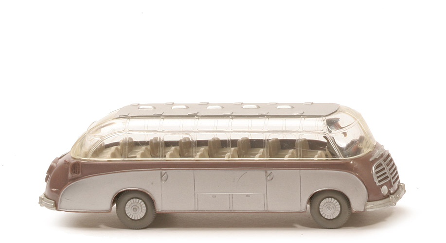 Karosserie Typ | Serie | Karosserie Farbe | braunmetallic | Schlitze für Dach | lang und breit | Armaturenbrett | trapezförmig | Gestaltung Zierline Front | mit Punkt, gesilbert | Boden Fahrgastraum | mit Struktur | Gestaltung Seite | Schablonierung silber | Fahrersitz Farbe | hellgelbgrau | Sitzreihen | hellgelbgrau, gesteckt | Fahrer Typ | groß, mit Mütze | Fahrer Farbe | basaltgrau | Lenkrad Typ | klein, zwei Speichen | Lenkrad Farbe | staubgrau | Dach Befestigung | geklebt (hier gelöst) | Dach Gestaltung oben | glatt, Schablonierung silbern | Dach Typ Haltenasen | lang und breit | Chassis Farbe | hellgelbgrau | Chassis Typ | Typ 2 | Achshalterungen hierbei | geschlossen | Bodenprägung hierbei | WM im Kreis | Bemalung Hauptscheinwerfer | silber | Bemalung Nebelscheinwerfer | silber | Bemalung Grill und Zierlinie | silber | Bemalung Stoßstangen | silber | Bemalung Rückleuchten | rot | Bemalung Blinker hinten | rot | Bemalung Kennzeichen hinten | silber | Bemalung 3 Zierlinien hinten | silber | Bemalung Lüfter | ohne | Räder Typ | Trilex Bus, mit Profil | Räder Ausführung | staubgrau, Felgen gesilbert |