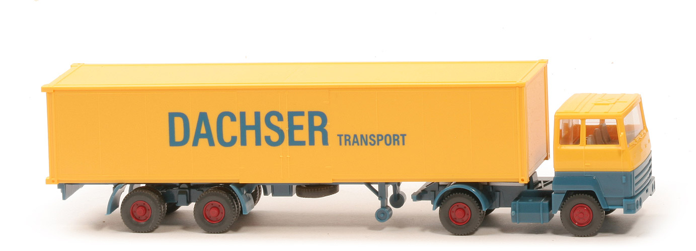 | Zugmaschine | Fahrerhaus Typ | Version 1 | Kabine oben | gelb | Kabine unten | azurblau | Verglasung | klar | Inneneinrichtung | ca. graubeige, Lkr integriert | Chassis | azurblau, einfache Halterung der Sattelpfanne | Bodenprägung | WIKING Berlin-W | Sattelpfanne | für großen Königsbolzen | Radlauf hinten | azurblau | | Kofferauflieger | Art | mit Seitentür-Andeutung | Dach | gelb | Korpus | gelb | Türen | gelb | Beschriftung beidseits | Dachser Transport | Beschriftung Art | Druck azurblau | Chassis Typ | Schwingachsen, wie Container-Trailer | Chassis Farbe | azurblau | Unterfahrschutz | ohne | | Räder | Typ | 12mm, Profil grob | Felgen | 6-Loch, hellbraunrot |
