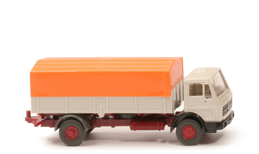 Kabine | grauweiß | Spiegelaufnahmen | mit | Grill | eingesetzt, mit Silberstreifen neben Stern | Verglasung | klar | Inneneinrichtung | Lenkrad integriert, ca. graubeige | Stoßstange, vorderer Kotflügel | schwarz | Typ vorderer Kotflügel | ohne Wulst | Scheinwerfer | unbemalt, ohne integrierte Blinker | Chassistyp | Zughaken auf Dreieck | Chassisfarbe | hellbraunrot | Radlauf hinten | basaltgrau | Reserverad | mittig unter Prtische | Pritsche | grauweiß | Pritschengestell | hellbraunrot | Pritscheneinlage | lichtgrau | Plane Farbe | rotorange | Plane Typ | niedrig, hinten offen, Steckleisten seitlich | Räder | 12mm, Profil grob | Felgen | hellbraunrot |