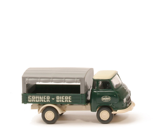 Kabine | "moosgrün" | Verglasung | klar | Bemalung Scheinwerfer | silber | Bedruckung vorne | Hanomag-Logo, "Hanomag", "Kurier" silbern | Bemalung Kennzeichen | ohne | Grill | schwarz hinterlegt | Inneneinrichtung | ca. staubgrau, mit Lkr | Türdruck | Grüner Biere | Chassis | hellelfenbein | Bodenprägung | neues WIKING-Logo, Germany | Pritsche | "moosgrün" | Druck Pritsche | Grüner Biere | Rückleuchten | unbemalt | Nummernschild hinten | unbemalt | Plane | ca. staubgrau | Räder | 9 mm, Felge eingesetzt | Felgen | ca. hellelfenbein |