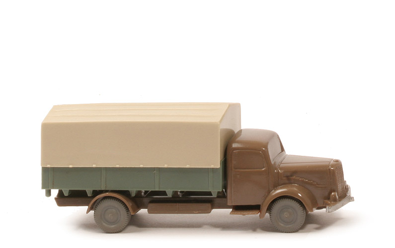 Achsen | Rollachser | Farbe Kabine u. Chassis | blassbraun | Verstärkung Trittbretter | mit | Bemalung Kabine | Scheinwerfer, Stoßstange | Version Chassis | Version 1b | Chassis Farbe | blassbraun | Bodenprägung | WM im Kreis | Pritsche | Seiten glatt | Farbe Pritsche | dunkelresedagrün | Zughaken | nach unten | Zapfen | Flachzapfen | Kennzeichen | bemalt silbern | Befestigung Pritsche | geklebt | Plane | ca. hellelfenbein | Räder | 10mm, mit Profil |