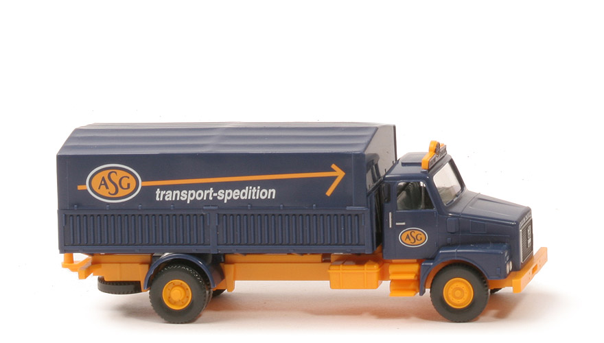 Recht schnell vergriffenes Serienmodell, zu dem Herr Wasmus einen passenden 3-Achs-Anhänger aufgelegt hat. Schön gestaltet. Auch die Türgriffe und die Haltegriffe an der Kabine sind gesilbert. Die Farbangabe "saphirblau" findet sich nicht in der Farbkarte von Herrn Wanner. Die Farbe entspricht der Farbe der alten ASG-Modelle die mit "stahlblau" angegeben wurde. |