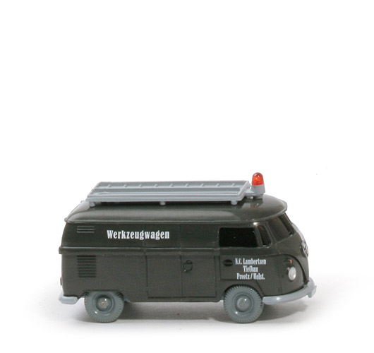 Farbe Karosserie oben | umbragrau | Farbe Karosserie unten | umbragrau | Heckscheibe | groß | Chassis Ausführung | separates Bauteil | Dach | mit 2 starken Längstraversen | Verglasung | getönt | Inneneinrichtung | ohne | Dachaufbau | silbergrau | Warnlicht | an Dachaufbau, orangetransparent | Chassis Farbe | silbergrau | Bodenprägung | Wiking Germany | Beschriftung Seiten | "Werkzeugwagen " | Beschriftung Türen | "N.C. Lambertsen, Tiefbau, Preetz/Holst." | Beschriftung Art | Druck weiß | Bedruckung vorne | Scheinwerfer, VW-Emblem silbern, Blinker orange | Bedruckung hinten | Rückleuchten rot | Räder | ca. staubgrau, Nabe gewölbt |
