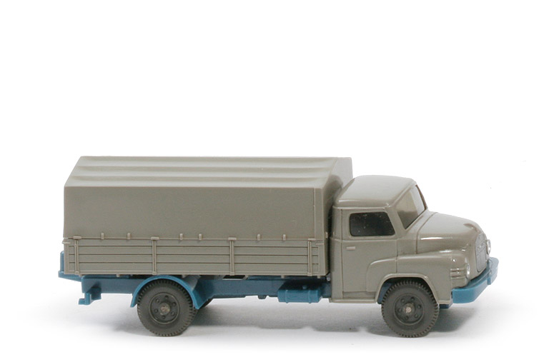 Modellversion | Typ 3 - Chassis neu, Pritsche neu | Farbe Kabine | betongrau | Verglasung | getönt | Grill | silbern eingesetzt | Bemalung | nur Scheinwerfer | Inneneinrichtung | glatte Bank | Haltenasen Kabine | mit | Chassis Art | Typ 3 | Bodenprägung | WM, GERMANY, 41 | Bereich Kardan hinten | geschlossen | Rücklichtstange | mit | Pritschenabstützung | Stege | Arretierung Haltenasen | mit | Chassisfarbe | azurblau | Pritsche Art | fein strukturiert | Pritschenseiten | gerade, feine Struktur | Pritschenunterseite | 6 schmale Quertraversen | Pritsche Farbe | betongrau | Pritscheneinlage | silbern | Bemalung Rückleuchten | ohne | Plane | betongrau, glänzend | Räder | 6-Loch |