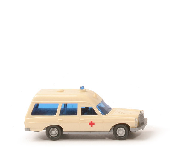 Farbe Karosserie | creme | Blaulicht | durchgesteckt, Teil der Verglasung | Scheinwerfer | transparent eingesetzt | Grill | silbern, Teil des Chassis | Verglasung | blautransparent | Lenkrad | integriert | Chassis Farbe | silbern | Bodenprägung | Mercedes/200/WIKING/Berlin-W | Bemalung | ohne | Druck | Rotkreuz auf Vordertüren | Räder Typ | Riffelkappe | Räder Farbe | anthrazit | Felgen | gesilbert |