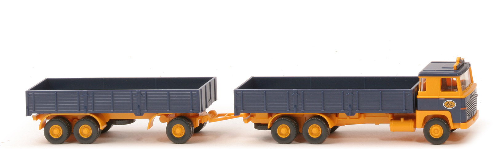 | Zugwagen | Kabinendach | "saphirblau", Dachschild ASG melonengelb | Kabine oben | melonengelb | Kabine unten | "saphirblau" | Stoßstange | melonengelb | Frontbeschriftung | SCANIA geprägt, gesilbert | Bedruckung Grill | waagerechte Streben silbern | Prägung Grill | mit 111, gesilbert | Scheinwerfer | an der Kabine, gesilbert | Spiegel | mit | Scheibenwischer | mit | Inneneinrichtung | ca. ockerbraun, mit Lkr integriert | Chassis | melonengelb | Bodenprägung | neues WIKING-Logo, altes Germany | Radlauf hinten | 1-teilig, melonengelb | Pritsche | Hochpritsche, "saphirblau" | Pritscheneinlage | ca. platingrau | | Anhänger | Pritsche | Hochpritsche, "saphirblau" | Pritscheneinlage | ca. platingrau | Chassis | melonengelb | Hinterachsaufhängung | für Doppel-Bereifung | Bodenprägung | neues WIKING-Logo | Drehschemel | für Doppel-Bereifung, eingesteckt, melonengelb | Bodenprägung Drehschemel | 40d | Reserverad | mittig unter Chassis gesteckt | Deichsel | melonengelb | | Räder | Typ | 12mm, Profil grob | Felgen | 8-Loch, melonengelb |
