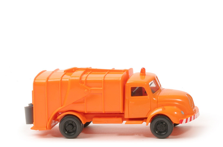 Farbe Kabine | "pastellorange" | Version Kabine | Neuauflage ähnlich Typ 4a | Blinker | kurz und dick | Dach | mit aufgeklebtem Warnlicht auf Sockel "pastellorange" | Bedruckung Scheinwerfer | silbern | Bedruckung Grill | Grillumrandung, Magrius-Logo silbern | Bedruckung Stoßstange | Warnbake rot/weiß | Verglasung | klar | Inneneinrichtung | schwarz, mit separatem Lenkrad | Achshalterungen | offen | Chassis Farbe | "pastellorange" | Bodenprägung | WM, neues WIKING-Logo | Aufbau | "pastellorange" | Version | mit Haltenase | Warnbake | Papieraufkleber rot/weiß | Mülltonnen | 2 in Tüte beigefügt, basaltgrau | Bedruckung Nummernschild | ohne | Bedruckung Rückleuchten | ohne | Räder | 11 mm, Felgen eingesetzt | Felgen | 6-Loch, schwarz |