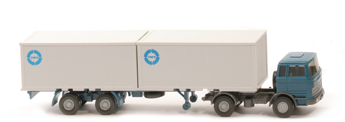 | Zugmaschine | Kabine oben | azurblau | Kabine unten | azurblau | Streifen | ohne | Verglasung | getönt | Inneneinrichtung | ca. silbergrau | Lenkrad | ohne | Grill | silbern | Stoßstange, Radlauf vorn | basaltgrau | Chassistyp | neu | Chassisfarbe | basaltgrau | Radlauf hinten | basaltgrau | Reserverad | hinter Kabine | Sattelpfanne | für großen Königsbolzen | Räder | 12mm, Profil grob | Felgen | silbergrau | | Container | Art | 2 x 20 ft Plywood-Container | Dach | altweiß | Korpus | altweiß | Türen | altweiß | Beschriftung | IWT (siehe Foto) | Beschriftung Art | blauer Druck | | Auflieger | Farbe | azurblau | Unterfahrschutz | ohne | Königsbolzen | stark | Räder | 12mm, Profil grob | Felgen | silbergrau |