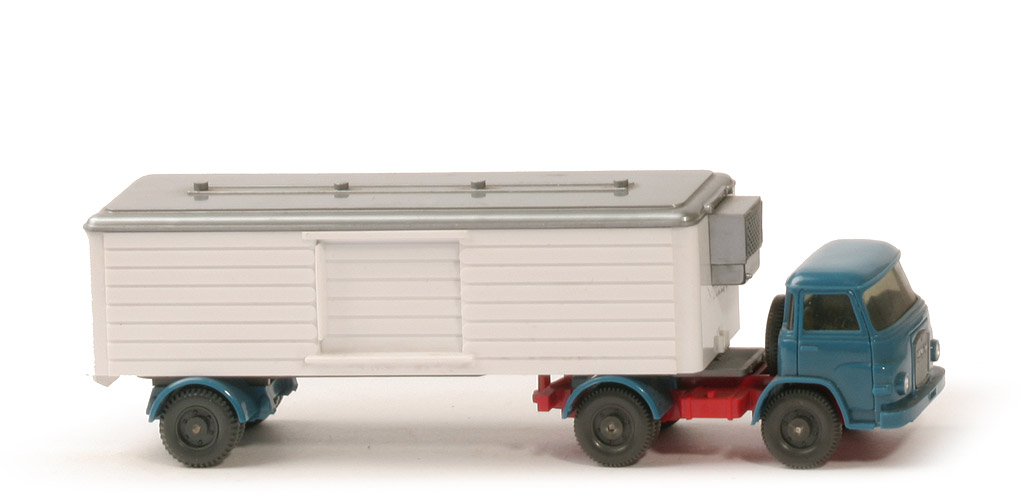 | Zugmaschine | Farbe Kabine | azurblau | Verglasung | leicht grtönt | Inneneinrichtung | ca. hellgelbgrau | Grill | silbern eingesetzt | Farbe Chassis | rot | Bemalung | Scheinwerfer | Sattelpfanne | für kleinen KöBo, Übergangsversion | Radlauf hinten | azurblau | Bodenprägung | WM Germany | Reserverad | hinter Kabine | Räder | 11 mm, einteilig, Profil fein | | Auflieger | Dach | silbern | Aufbau | weiß | Bodenprägung Aufbau | Wiking Modell, MiG, 52, Viking Model | Kühlaggregat | silbern | Radlauf | azurblau | Achshalterungen | Typ 2 | Chassis | anthrazit | Stützrollen | ohne | Königzapfen | integriert, nach hinten versetzt | Bodenprägung Chassis | ohne | Räder | 11 mm, anthrazit, Profil grob |