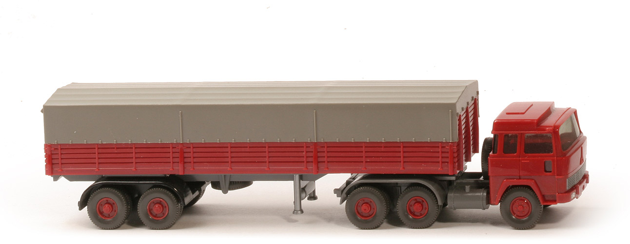| | Zugmaschine | | Kabine oben | hellbraunrot | | Kabine unten | hellbraunrot | | Verglasung | stark getönt | | Inneneinrichtung | ohne | | Grill | silber | | Chassis | basaltgrau | | Radlauf hinten | basaltgrau, 1-teilig | | Sattelpfanne | für großen Königsbolzen | | Reserverad | hinter Kabine | | Räder | Profil fein | | Felgen | hellbraunrot | | | Auflieger | | Farbe Pritsche | hellbraunrot | | Pritschentyp | Holzpritsche ohne Lasche | | Chassis | basaltgrau | | Königsbolzen | stark | | Pritscheneinlage | silbergrau | | Doppelachsaggregat | Klemmplatte | | Doppelachsaggregat Farbe | schwarz | | Bodenprägung Achseinheit | Germany, Wiking | | Reserverad | ja | | Stütze | starr, silbern, Hydraulikstempel | | Plane | ca. steingrau | | Plane Art | Seite 3 Mark., vorne offen | | Beschriftung | ohne | | Räder | Profil fein | | Felgen | hellbraunrot |