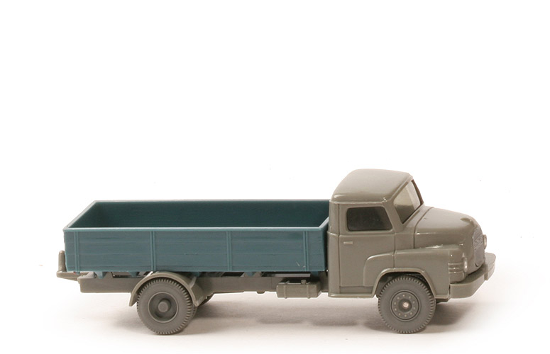 Modellversion | Typ 1 - Chassis alt, Pritsche alt | Farbe Kabine | betongrau | Verglasung | getönt | Grill | silbern eingesetzt | Bemalung | nur Scheinwerfer | Inneneinrichtung | ohne | Haltenasen Kabine | ohne | Chassis Art | Typ 1 | Bodenprägung | nur WM | Bereich Kardan hinten | offen | Rücklichtstange | ohne | Pritschenabstützung | punktuell | Arretierung Haltenasen | ohne | Chassisfarbe | betongrau | Pritsche Art | Normpritsche | Pritschenseiten | waagerechte Gravuren | Farbe Pritsche | ozeanblau | Rückleuchten | eingerückt | Kennzeichen | zweiteilig | Pritscheneinlage | ohne | Bemalung Rückleuchten | rot | Bemalung Kennzeichen | silbern | Räder | 11mm, vorne 10-Loch, hinten Felgen verteift |