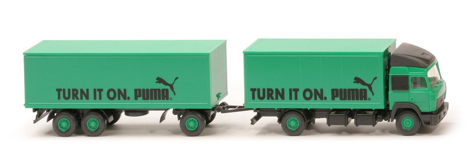 | Zugwagen | Kabine | grün | Dachspoiler | schwarz | Verglasung | klar | hintere seitl. Kabinenfenster | schwarz geschlossen | Inneneinrichtung | ca. silbergrau, Lkr integriert | Stoßstange, Grill | schwarz | Ansaugstutzen | schwarz | Chassis | schwarz | Bodenprägung Chassis | neues WIKING-Logo, Germany | Radlauf hinten | schwarz | Reserverad | seitlich unter Chassis | Koffer Korpus | grün | Koffer Dach | grün | Koffer Türen | grün | Räder | 12 mm, anthrazit | Felgen | 8-Loch, grün | | Anhänger | Koffer Korpus | grün | Koffer Dach | grün | Koffer Türen | grün | Chassis | schwarz | Achshalterungen | schwarz | Unterfahrschutz | schwarz | Reserverad | unter Chassis | Räder | 12 mm, anthrazit | Felgen | 8-Loch, grün | | Beschriftungen | Koffer Seiten | "Turn it on. Puma". Puma-Logo |