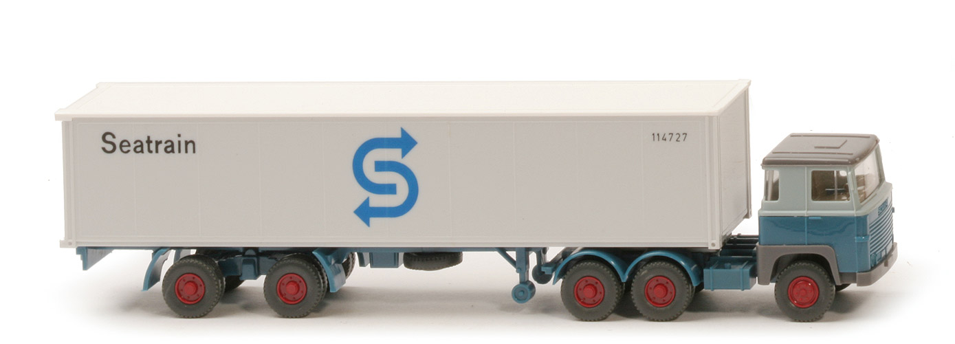 | Zugmaschine | Dach | basaltgrau | Kabine oben | hellblaugrau | Kabine unten | azurblau | Stoßstange | basaltgrau | Scheinwerfer | 2 | Spiegel | mit | Scheibenwischer | ohne | Lenkrad | mit | hinterer Radlauf | 2-teilig, azurblau | Sattelpfanne | für großen Königsbolzen | Reserverad | ohne | Chassis Farbe | basaltgrau | Räder | 12mm, Profil grob | Felgen | hellbraunrot | | Container | Art | 40 ft Glattwand | Dach | weiß | Korpus | altweiß | Türen | neu, altweiß | Beschriftung | Seatrain ... (s. Foto) | Pfeile | ca. azurblau | | Auflieger | Farbe | azurblau | Unterfahrschutz | ohne | Königsbolzen | stark | Räder | 12mm, Profil grob | Felgen | hellbraunrot |