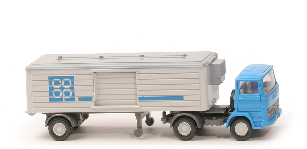 | Zugmaschine | Farbe Kabine | himmelblau | Verglasung | klar | Inneneinrichtung | ca. lichtgrau | Grill | silbern eingesetzt | Chassis | ca. basaltgrau, mit Zughaken | Bedruckung | ohne | Sattelpfanne | alt, mit Steg, für großen KöBo, ähnlich | Radlauf hinten | basaltgrau | Bodenprägung | Germany, neues WIKING-Logo | Reserverad | hinter Kabine | Räder | 11 mm, Felgen eingesetzt | Felgen | fast weiß | | Auflieger | Dach | grau | Aufbau | ca. altweiß | Bodenprägung Aufbau | nur noch "52" | Kühlaggregat | grau | Bedruckung | "COOP", Streifen himmelblau (s. Foto) | Radlauf | ca. basaltgrau | Achshalterungen | Typ 3 | Chassis | ca. basaltgrau | Stützrollen | ca. basaltgrau | Königzapfen | für starken KöBo, nach hinten versetzt | Bodenprägung Chassis | ohne | Räder | 11 mm, Felgen eingesetzt | Felgen | fast weiß |