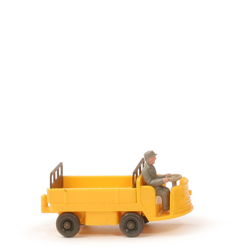Aufbau | gelb | Fahrer | ca. platingrau | Lenkrad | hellgelbgrau, 3-speichig | Bodenprägung | WM, Germany, 116 | Zughaken | integriert | Batteriekasten/Achshalterung | gelb | Aufsatz mit Messingwänden | mit | Bemalung | ohne | Räder | ca. 7 mm, anthrazit |