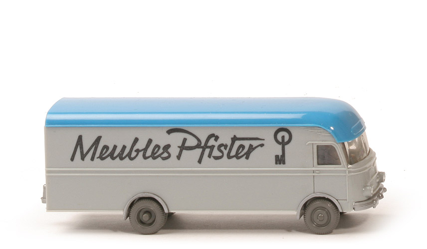 | | Zugwagen | | Aufbau Farbe | silbergrau | | Blinker vorne | ohne | | Verglasung | klar | | Inneneinrichtung | silbern | | Fahrer | ca. goldmetallic | | Kotflügel | Teil des Chassis | | Rückleuchten | groß | | Dach Farbe | himmelblau | | Dach Art | glänzend, ohne Positionsleuchten | | Türen | silbergrau, mit Knopf | | Türen Art | Typ 1: hoch, ohne Rand, mit Knopf | | Chassis Art | Typ 1 | | Chassis Farbe | silbern | | Bodenprägung Motorblock | WM | | Bodenprägung hinten | ohne | | Achshalterung vorne | geschlossen | | Achshalterung hinten | geschlossen | | Fläche unter hinterem Kardan | offen | | Fläche hinter Hinterachse | offen | | Tank | ohne | | Beschriftung | "Meubles Pfister", Logo | | Beschriftung Art | Stempeldruck schwarz | | Räder | 10mm hellgrau, alt |