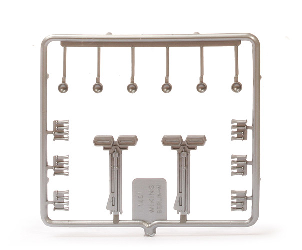 Grundfarbe | silbern | Prägung | "1401, WIKING, Berlin-W" | | am Spritzling: | Scheinwerfer | 6 Stück | Fanfaren | 6 Stück | Flutlichter | 2 Stück |
