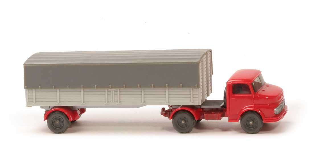 | Zugmaschine | Farbe Kabine | rot | Lüfter | ohne - Dach glatt | Eckfenster | immer ohne | Blinker | immer neben Scheinwerfern | Inneneinrichtung | ohne | Verglasung | leicht getönt | Chassis | hellbraunrot | Radlauf hinten | rot | Sattelpfanne | neu, für dünnen Bolzen | Reserverad | hinter Kabine, Profil fein | Räder | 11mm, einteilig, Profil fein | | Auflieger | Farbe Pritsche | achatgrau | Farbe Chassis | silber | Achshalterungen | Typ 2, rot | Bodenprägung Pritsche | WM ohne Kreis | Bodenprägung Chassis | WM ohne Kreis | Königsbolzen | mittig zentriert auf Aufnahmeplatte | Rückleuchten | mit | Nummernschild | nicht bemalt | Achshalterung | offen | Räder | 11mm, einteilig, Profil fein | | Plane | Farbe | basaltgrau | hinten | geschlossen | Innenprägung | WM im Kreis |