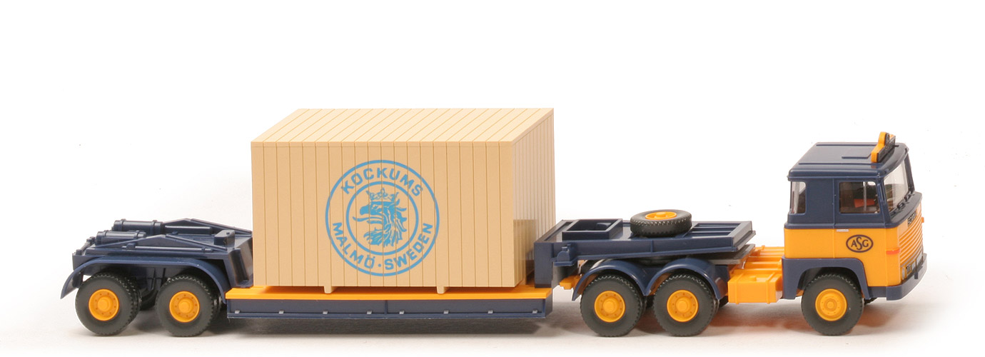 | Zugmaschine | Kabinendach | "saphirblau", Dachschild ASG melonengelb | Kabine oben | "saphirblau" | Kabine unten | melonengelb | Stoßstange | "saphirblau" | Frontbeschriftung | SCANIA und 111 silbern, "saphirblau" unterlegt | weitere Bedruckung | Blinker orange, Türgriffe, Scheinwerfer silbern | Bedruckung Türen | ASG-Logo | Scheinwerfer Ausführung | an der Kabine | Spiegel | mit | Scheibenwischer | mit | Inneneinrichtung | ca. ockerbraun, mit Lkr integriert | Sattelpfanne | für großen Königsbolzen | Reserverad | ohne | Chassis Farbe | melonengelb | Bodenprägung | neues WIKING-Logo | Radlauf hinten | 2-teilig, "saphirblau" | | Auflieger | Korpus | "saphirblau" | Pritscheneinlage | melonengelb | Bodenprägung | 503, neues WIKING-Logo | Achseinheit | Klipsachsen, Kotflügel rund, "saphirblau" | Reserverad | über Drehschemel | | Ladung | Ladung Typ | Kiste hellbeige | Bedruckung | "Kockums, Malmö - Sweden", Adler-Logo | | Räder | Typ | 12mm, Profil grob | Felgen | melonengelb, 8-Loch |
