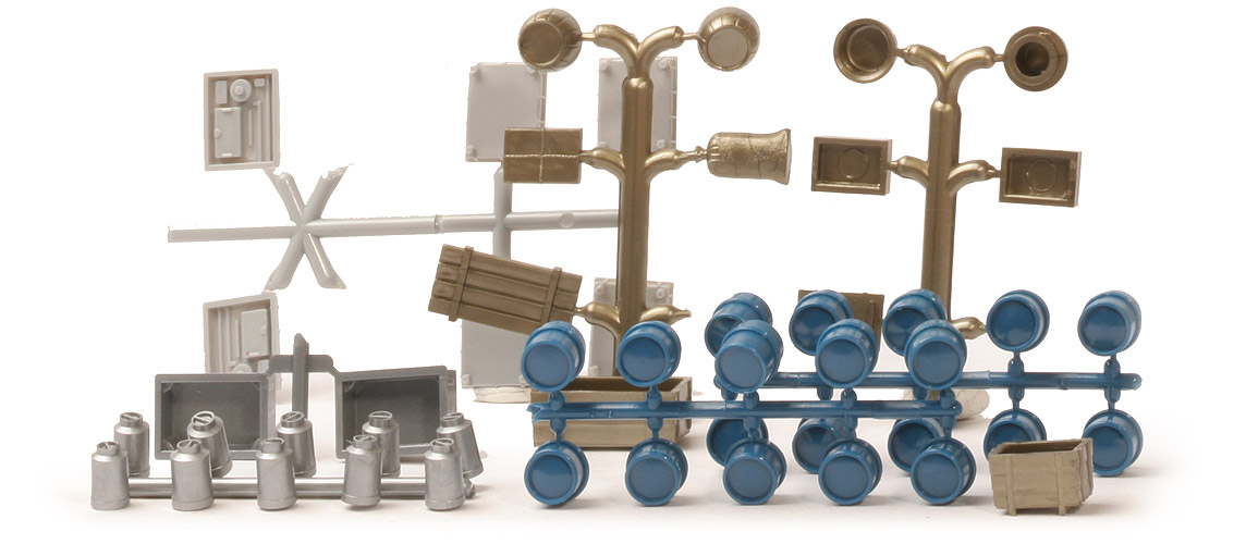 | Spritzling 1 | goldmetallic - Holzfaß, Paket, Sack, große Kiste | | Spritzling 2 | goldmetallic - Holzfaß, 2 Obstkisten, kleine Kiste | | Spritzling 3 | capriblau - 5 Ölfässer | | Spritzling 4 | capriblau - 5 Ölfässer | | Spritzling 5 | silbern - 10 Milchkannen | | Spritzling 6 | silbern - 2 hohe Stapelkästen | | Spritzling 7 | silbern - 4 Flachkästen, 2 Dachgepäckträger Postkäfer |