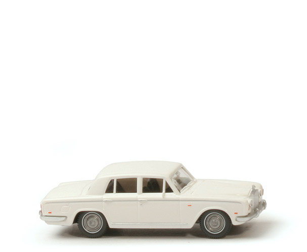 Sehr umfänglich liebevoll bedruckt. Vorn Kennzeichen weiß hinterlegt mit "RR 1" in schwarz. Blinker vorne orange. Seiten mit 3 Blinkern orange bedruckt, Zierleiste über Türgriffe laufend und unter den Türen silbern. Türschlösser silbern. Hinten neben Rückleuchten Kofferraumdeckelgriff silbern, Kennzeichen gelb hinterlegt mit "RR 1" in schwarz. Es liegt ein Verkehrsschild bei. Typ "Vorfahrt gewähren" Aufbau und Sockel silbern, bedruckt mit "GIVE WAY". |