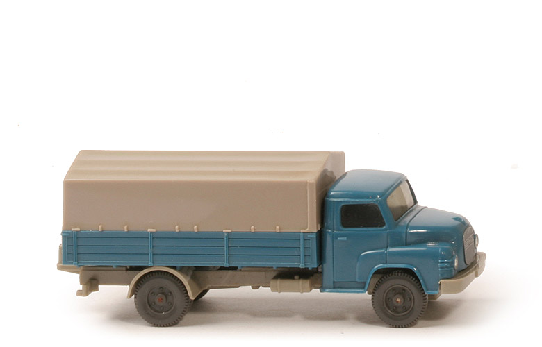Modellversion | Typ 3 - Chassis neu, Pritsche neu | Farbe Kabine | azurblau | Verglasung | getönt | Grill | silbern eingesetzt | Bemalung | nur Scheinwerfer | Inneneinrichtung | glatte Bank | Haltenasen Kabine | mit | Chassis Art | Typ 3 | Bodenprägung | WM, GERMANY, 41 | Bereich Kardan hinten | geschlossen | Rücklichtstange | mit | Pritschenabstützung | Stege | Arretierung Haltenasen | mit | Chassisfarbe | ca. olivgrau | Pritsche Art | fein strukturiert | Pritschenseiten | gerade, feine Struktur | Pritschenunterseite | 6 schmale Quertraversen | Pritsche Farbe | azurblau | Pritscheneinlage | silbern | Bemalung Rückleuchten | ohne | Plane | ca. braunelfenbein | Räder | 11 mm, 6-Loch, Profil fein |