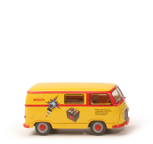 Grundfarbe | gelb | Karosserie Typ | Kasten | Seitenfenster Fahrerseite | eins | Seitenfenster Beifaherseite | zwei | Heckfenster | ohne | Scheinwerfer | klar transparent eingesetzt | Rückleuchten | rot transparent eingesetzt | Verglasung | klar transparent | Inneneinrichtung | Sitzreihen ca. hellbeige | Lenkrad | schwarz, separat eingesetzt | Grill | schwarz, separat eingesetzt | Stoßstangen | rot, separat eingesetzt | Chassis | schwarz | Bodenprägung | neues WIKING-Logo | Räder | 7,8 mm, 2-teilig | Felgen | silber, Radkappen rot | Bedruckung | " ... Bosch ... " (s. Foto) |