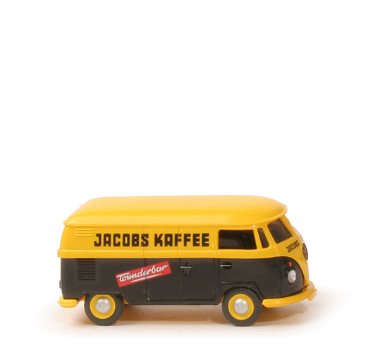Farbe Karosserie oben | gelb | Farbe Karosserie unten | schwarz | Heckscheibe | groß | Chassis Ausführung | separates Bauteil | Dach | ohne 2 Längstraversen | Verglasung | getönt | Inneneinrichtung | ohne | Chassis Farbe | gelb | Bodenprägung | neues WIKING-Logo | Beschriftung | "Jacobs Kaffee - wunderbar" ... (s. Foto) | Bedruckung Scheinwerfer | silbern | Bedruckung Blinker | orange | Bedruckung VW-Emblem | schwarz | Beschriftung Front | "Jacobs Kaffee" | Bedruckung Rückleuchten | rot | Räder | anthrazit, 8 mm, Felgen eingesetzt | Felgen | VW, gelb, Radkappen gesilbert |