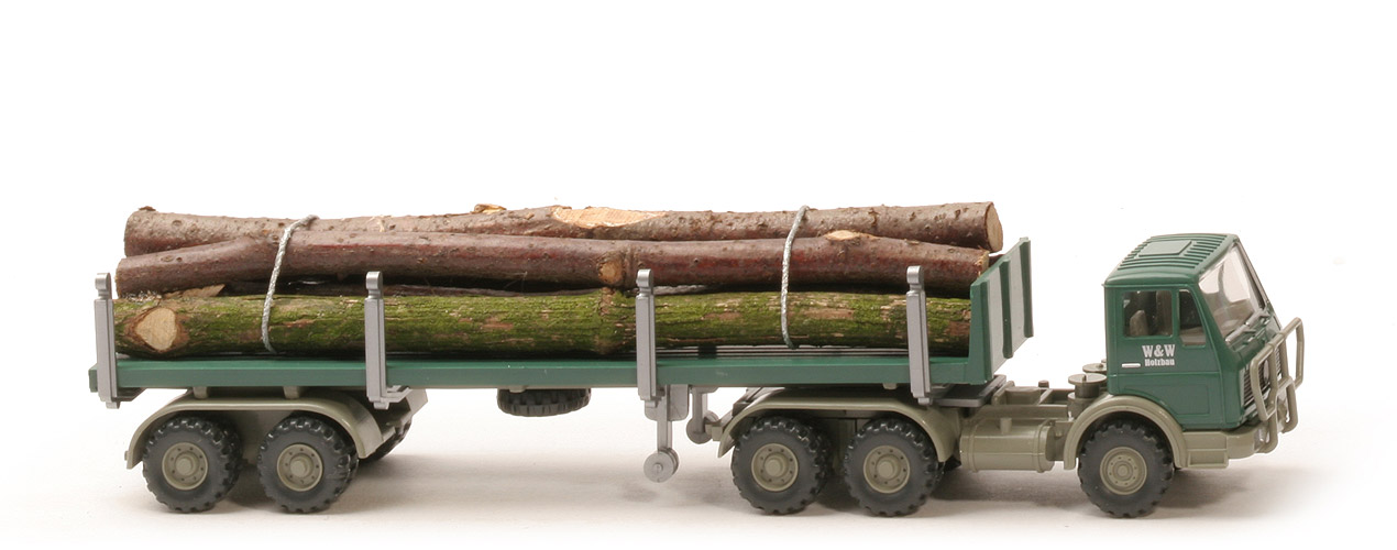 | Zugmaschine | Kabine | kieferngrün | Spiegelaufnahmen | ohne | Grill | schwarz, eingesetzt, ohne Silberstreifen neben Stern | Rammschutz | ca. helles zementgrau, angeklebt | Verglasung | klar | Inneneinrichtung | Lenkrad integriert, ca. olivgrau | Bedruckung Kabine | Türgriffe, Scheibenwischer silbern | Beschriftung Türen | "W&W Holzbau" silbern | Stoßstange, vorderer Kotflügel | ca. helles zementgrau | Typ vorderer Kotflügel | mit Wulst, mit Blinkern | Scheinwerfer | gesilbert, mit integrierten Blinkern | Chassis | ca. helles zementgrau | Kardanelement | ca. helles zementgrau | Bodenprägung | Germany | Seilwindenaggregat | ca. helles zementgrau | Bedruckung Rückleuchten | rot | | Auflieger | Farbe | ca. helles zementgrau | Bodenprägung | neues WIKING-Logo, 51r | Königsbolzen | stark | Achseinheit | Klemmplatte Wiederauflage, ca. helles zementgrau | Reserverad | unter Auflieger | Rungen | silbern | Bedruckung Rückleuchten | rot | Ladung | Echtholz, rund | | Räder | Typ | Profil sehr grob, 12 mm, Felgen eingesetzt | Felgen | ca. helles zementgrau |
