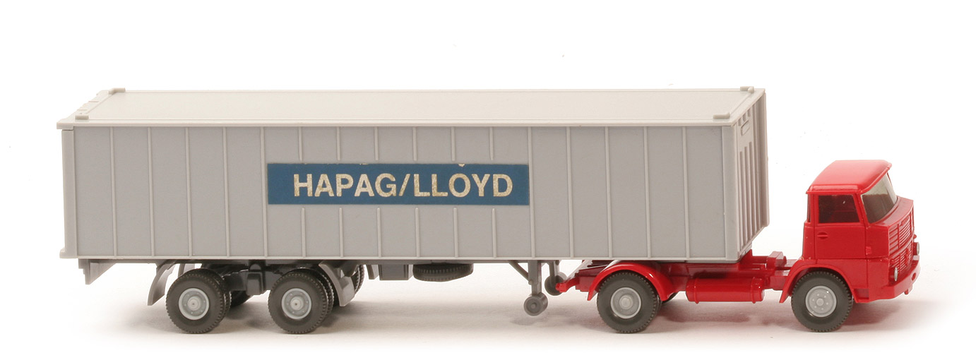| Zugmaschine | Kabine oben | rot | Kabine unten | rot | Verglasung | getönt | Chassistyp | neu | Zughaken | ohne | Fläche hinter Sattelpfanne | 3 Stege | Chassisfarbe | rot | Sattelpfanne | neu, für dünnen Bolzen | Reserverad | ohne | Räder | 12mm, Profil fein | Felgen | silbergrau | | Container | Art | 1 x 40 ft, gerippt | Dach | silbergrau | Korpus | silbergrau | Türen | silbergrau | Unterkante | schmal | Beschriftung | Hapag-Lloyd (s. Foto) | Beschriftung Grösse | 7 Felder, Papieraufkleber | | Auflieger | Farbe | basaltgrau | Unterfahrschutz | ohne | Königsbolzen | dünn | Räder | 12mm, Profil fein | Felgen | silbergrau |