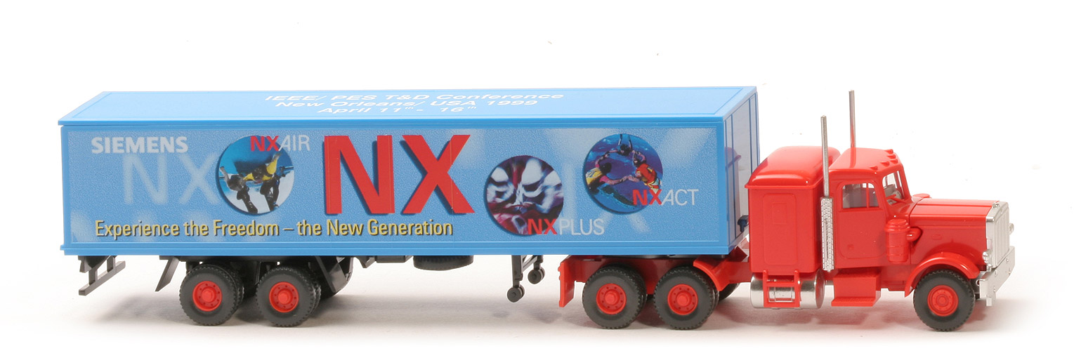 | Zugmaschine | Kabine | orangerot, mit Scheibenwischern | Dach | mit 5 Positionsleuchten | Haube/vordere Kotflügel | helles orangerot, kippbar, Blinker auf Kotflügel | Seitenaggregate | helles orangerot | Grill, Scheinwerfer, Stoßst. | helles orangerot, mit Kennzeichen | Schlafkabine | helles orangerot | hier Dach | helles orangerot | Auspuffrohre, Tanks | verchromt | Chassis, Motor, Kotflügel, ... | helles orangerot | Kardanplatte | helles orangerot | hier Bodenprägung | neues WIKING-Logo, Germany | Sattelpfanne | silbern, für großen Königsbolzen | Bedruckung | ohne | Reserverad | ohne | | Auflieger | Typ | Koffer, Chassis gesteckt | Farbe | ca. himmelblau | Türen | ca. himmelblau | Bedruckung Seiten | "Siemens, NX, ..." | weitere Beschriftung | Dachfolie "... New Orleans/ USA 1999, ..." | Chassis | schwarz, mit Unterfahrschutz | Chassis Bodenprägung | WIKING, Berlin-W | DAA Typ | Klipsachsen, Kotflügel eckig | DAA Farbe | schwarz | Reserverad | unter Chassis gesteckt | Stütze | Rollen, schwarz | | Räder | Typ | 12 mm, 2-teilig, Felgen eingesetzt | Felgen | 8-Loch, helles orangerot |