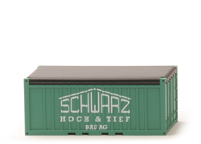 Größe | 20 ft | Typ | Open Top | Farbe Korpus | ca. dunkeltürkis | Farbe Dach | schwarz | Beschriftung | "Schwarz Hoch Tief Bau AG" | Beschriftung Art | Druck, weiß |