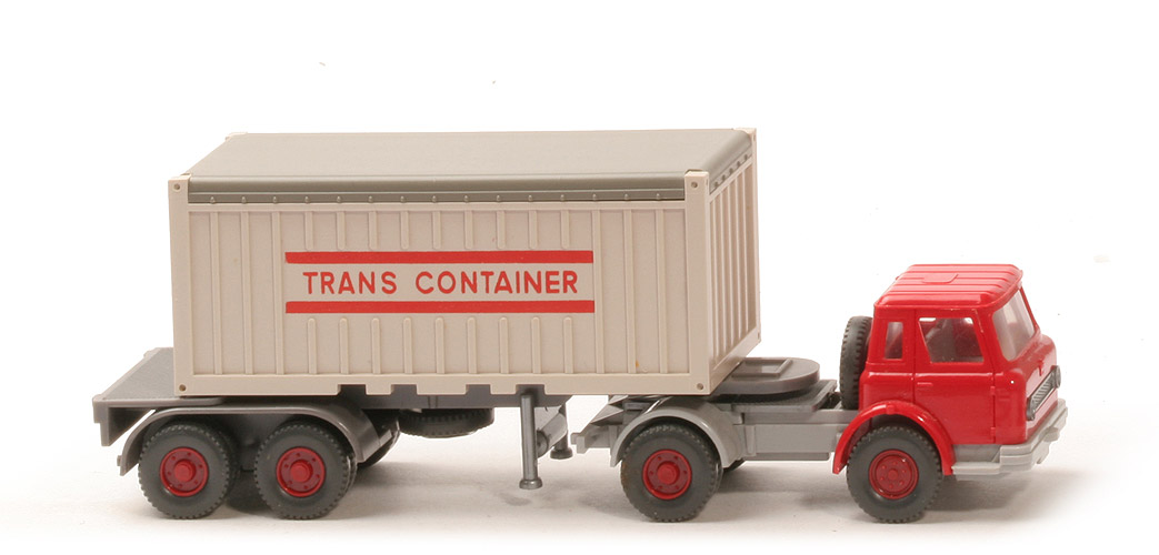 | Zugmaschine | Kabine | rot | Lüfter | mit | Inneneinrichtung | silbergrau | Verglasung | klar | Chassis | silbergrau | Radlauf hinten | silbergrau | Sattelpfanne | für großen Königsbolzen | Reserverad | hinter Kabine | Räder | Profil grob | Felgen | hellbraunrot | | Container | Art | Open Top | Farbe Korpus | hellelfenbein | Farbe Dach | betongrau | Beschriftung | Trans Container (s. Foto) | Beschriftung Art | Druck rot | | Auflieger | Farbe | basaltgrau | Variante | mit Markierung, mit Bohrungen neben KoBo | Reserverad | unter Auflieger, gesteckt | Bodenprägung | 52h | Doppelachsaggregat Farbe | basaltgrau | Doppelachsaggregat Typ | Klemmplatte WIKING u. GERMANY | Hydraulikstützen | silbern, gesteckt | Räder | Profil grob | Felgen | hellbraunrot |
