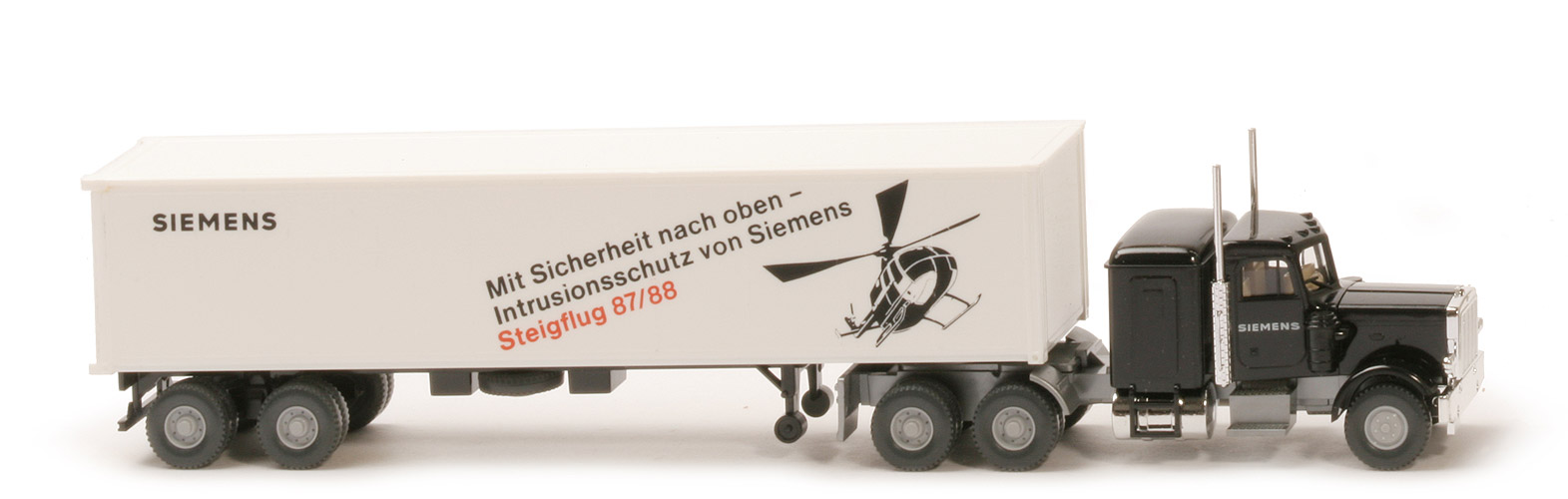 | Zugmaschine | Kabine | schwarz, mit Scheibenwischern | Dach | mit 5 Positionsleuchten | Haube/vordere Kotflügel | schwarz, kippbar, Blinker auf Kotflügel | Seitenaggregate | schwarz | Grill, Scheinwerfer, Stoßst. | verchromt, mit Kennzeichen | Schlafkabine | schwarz | hier Dach | schwarz | Auspuffrohre, Tanks | verchromt | Chassis, Motor, Kotflügel, ... | silbern | Kardanplatte | silbern | hier Bodenprägung | neues WIKING-Logo, Germany, Berlin-W | Sattelpfanne | silbern, für großen Königsbolzen | Bedruckung Türen | "Siemens" | Reserverad | ohne | | Container | Art | Glattwand | Farbe | weiß | Türen | weiß | Beschriftung Seiten | "Siemens, Steigflug, ..." | Beschriftung vorne | ohne | Beschriftung Art | Druck rot, schwarz | | Auflieger | Typ | für Peterbilt, Achsaggregat nach hinten versetzt | Farbe | schwarz | Reserverad | mittig unter Chassis gesteckt | Unterfahrschutz | mit | Bodenprägung | neues WIKING-Logo, Germany, Berlin-W | | Räder | Typ | 12 mm, 2-teilig, Felgen eingesetzt | Felgen | vorne 6-Loch, hinten 8-Loch silbergrau |