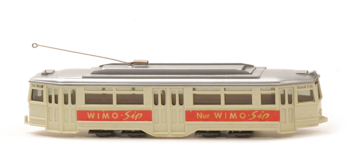 Karosserie Farbe | hellgrünbeige | Karosserie Bodenprägung | WM im Kreis | Zughakenloch vorne | mit Schlitz | Verglasung | getönt | Farbe Dach | silbern | Stromabnehmer | Draht, mit Feder | Acheinheiten Typ | ohne seitliche Verstärkung | Achseinheiten Bodenprägung | ohne | Achseinheiten Farbe | anthrazit | Rader Typ | 7 mm, Scheibenräder | Räder Farbe | ca. basaltgrau | Bemalung | ohne | Beschriftung | WIMO-SIP ... (s. Foto) | Beschriftung Art | Abziehbild |