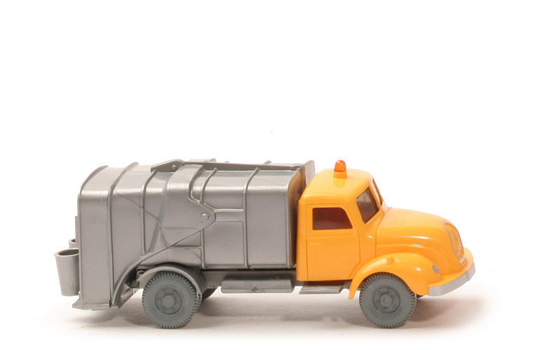 Farbe Kabine | helles melonengelb | Version Kabine | Neuauflage ähnlich Typ 4a | Blinker | kurz und dick | Dach | mit aufgeklebtem Warnlicht auf Sockel "pastellorange" | Bedruckung Scheinwerfer | silbern | Bedruckung Grill | Grillumrandung, Magrius-Logo silbern | Bedruckung Stoßstange | silbern | Verglasung | klar | Inneneinrichtung | ohne | Achshalterungen | offen | Chassis Farbe | silbern | Bodenprägung | WM, neues WIKING-Logo | Aufbau | silbern | Version | mit Haltenase | Warnbake | Papieraufkleber rot/weiß | Mülltonnen | 2 in Tüte beigefügt, basaltgrau | Bedruckung Nummernschild | ohne | Bedruckung Rückleuchten | ohne | Räder | 11 mm, einteilig, Profil fein, ca. staubgrau |