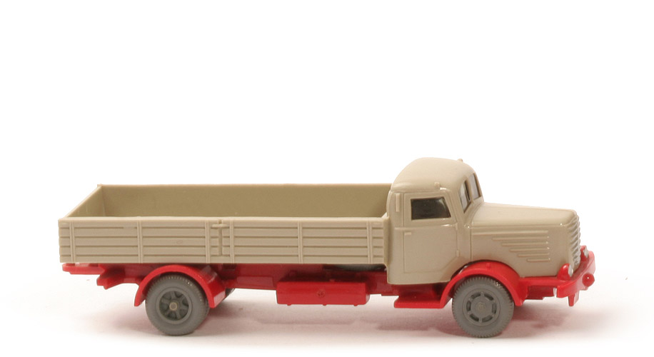 | Kabine Farbe und Pritsche | hellgelbgrau | | Blinker | mit | | Bemalung Scheinwerfer | silbern | | Bemalung Kennzeichen | ohne | | Positionsleuchten | mit | | Warndreieck | ohne | | Pritschenboden | grob strukturiert | | Pritschenrückseite | Struktur wie Seite | | Chassis | Version 4 | | Farbe Chassis | rot | | Vorderachshalterung | mit Steggravur | | Chassis hinter Hinterachse | geschlossen | | Bodenprägung Verteilergetriebe | WM | | hintere Achshalterung | offen | | Auspuff | zur Beifahrerseite | | Zughaken | ca. 4,5 mm lang, 1,5 mm stark | | Rücklichtstange Beifahrerseite | mit | | Bodenprägung hinten | ohne | | Reserverad | vorne unter Pritsche | | Bemalung Kennzeichen | ohne | | Rückleuchte | mit, unbemalt | | Plane | hier ohne | | Räder | Trilex mit Profil ca. basaltgrau |