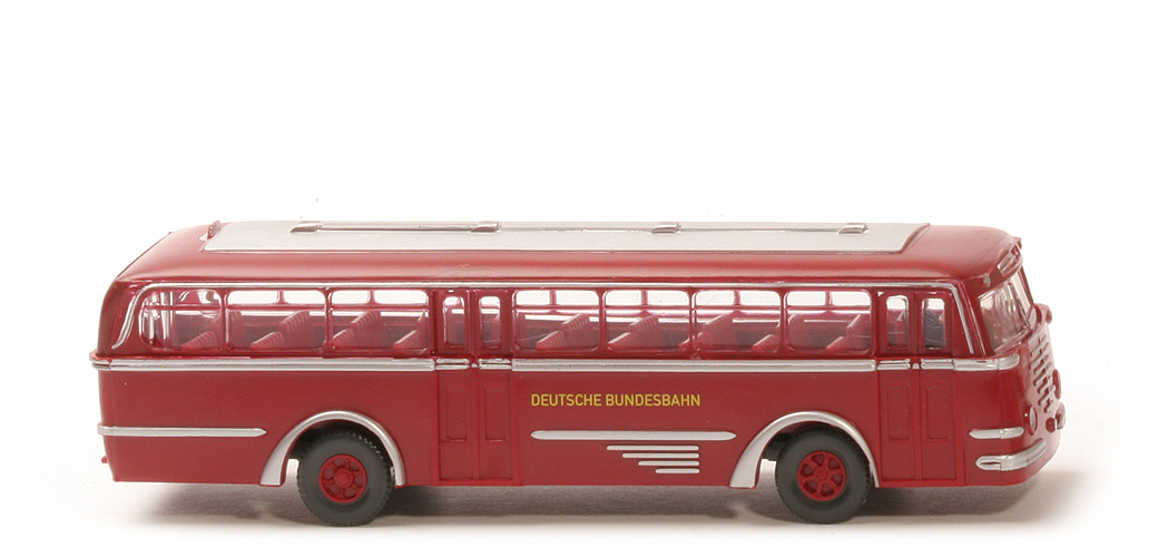 | Karosserie | Typ Karosserie | Typ 2 | Farbe | rubinrot | Scheinwerfer | konkav | Grill | neu | unterer Türabschluss | bündig mit Karosserie | angedeutete Fenster in Türen | eckig | Heck | Version 6 | Heckbeschriftung BÜSSING | ohne | Rückleuchten | mit, 2-stufig | Nummernschild hinten | mit | Bodenprägung | 72, neues WIKING-Logo, Germany | Chassishalterungen | ohne | | Dach | Typ | mattiert, 4 Lüfter | Farbgestaltung | Lack hellbraunrot, Mittelfläche gesilbert | | Inneneinrichtung | Typ Inneneinrichtung | Sitze fein | Farbe | rot | Lenkrad | 4-speichig, am Fahrer | Lenkrad Farbe | creme | Fahrer | ca. kobaltblau | | Chassis | Bodengruppe | ähnlich Typ 6 - neues Logo | Chassis Farbe | ca. basaltgrau | | Räder | Typ | 12mm, Profil grob | Felgen | Trilex neu, rubinrot |