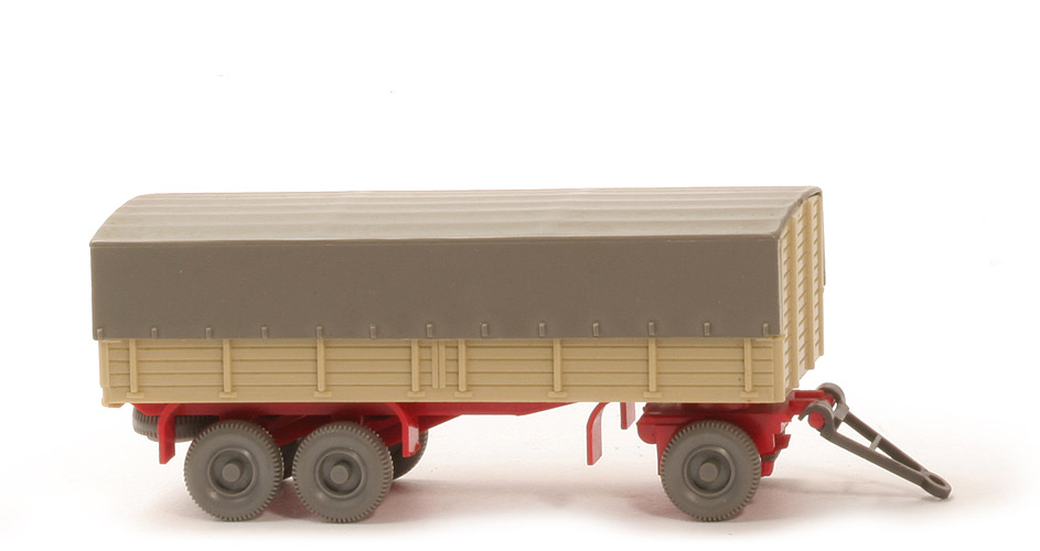 | Pritsche | Farbe | grünbeige | Rückleuchten | mit | Herstellerkennzeichnung | WM / Germany | | Chassis | Farbe | rot | Achshalterungen | offen | Drehschemel | eingesteckt | Deichsel | beweglich, angesteckt, Kunststoff | | Plane | Plane Typ | hinten offen, gerafft | Plane Farbe | steingrau | | weitere Details | Bemalung Nummernschild | ohne | Räder Typ | 12mm, mit Profil | Räder Farbe | ca. staubgrau |