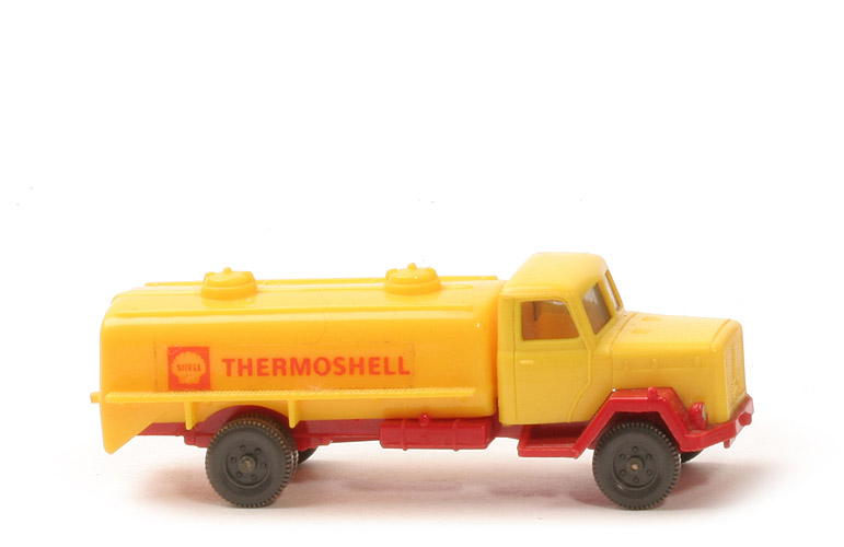 Kabine | zinkgelb | Verglasung | getönt | Inneneinrichtung | ohne | Bemalung vorn | Scheinwerfer silber | Chassis Farbe | rot | Chassis Art | Version 4 | Bodenprägung | WM und Germany | Tank | gelb | Beschriftung Seite | THERMOSHELL (s. Foto) | Art der Beschriftung | Folienaufkleber | Bemalung Rückleuchten | rot | Räder | 11 mm, 6-Loch, anthrazit |