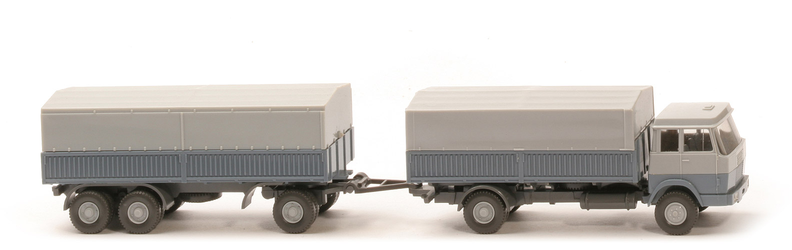 | Zugwagen | Kabine oben | silbergrau | Kabine unten | graublau | Verglasung | klar | Inneneinrichtung Farbe | graublau | Inneneinrichtung Typ | 3 Sitze | Lenkrad | ohne | Scheinwerfer | silbern bemalt | Chassistyp | Zughaken auf Dreieck | Chassisfarbe | basaltgrau | Radlauf hinten | basaltgrau | Reserverad | mittig unter Chassis | Pritsche | graublau | Pritschengestell | basaltgrau | Pritscheneinlage | silber | Plane | silbergrau | Räder | 12mm, Profil grob | Felgen | silbergrau | | Anhänger | Pritsche | graublau | Chassis | basaltgrau | Deichsel | Kunststoff | Reserverad | mittig unter Chassis | Pritscheneinlage | silber | Plane | silbergrau | Bereifung | Doppelbereifung | Räder | 12mm, Profil grob | Felgen | silbergrau | Beschriftung | ohne |